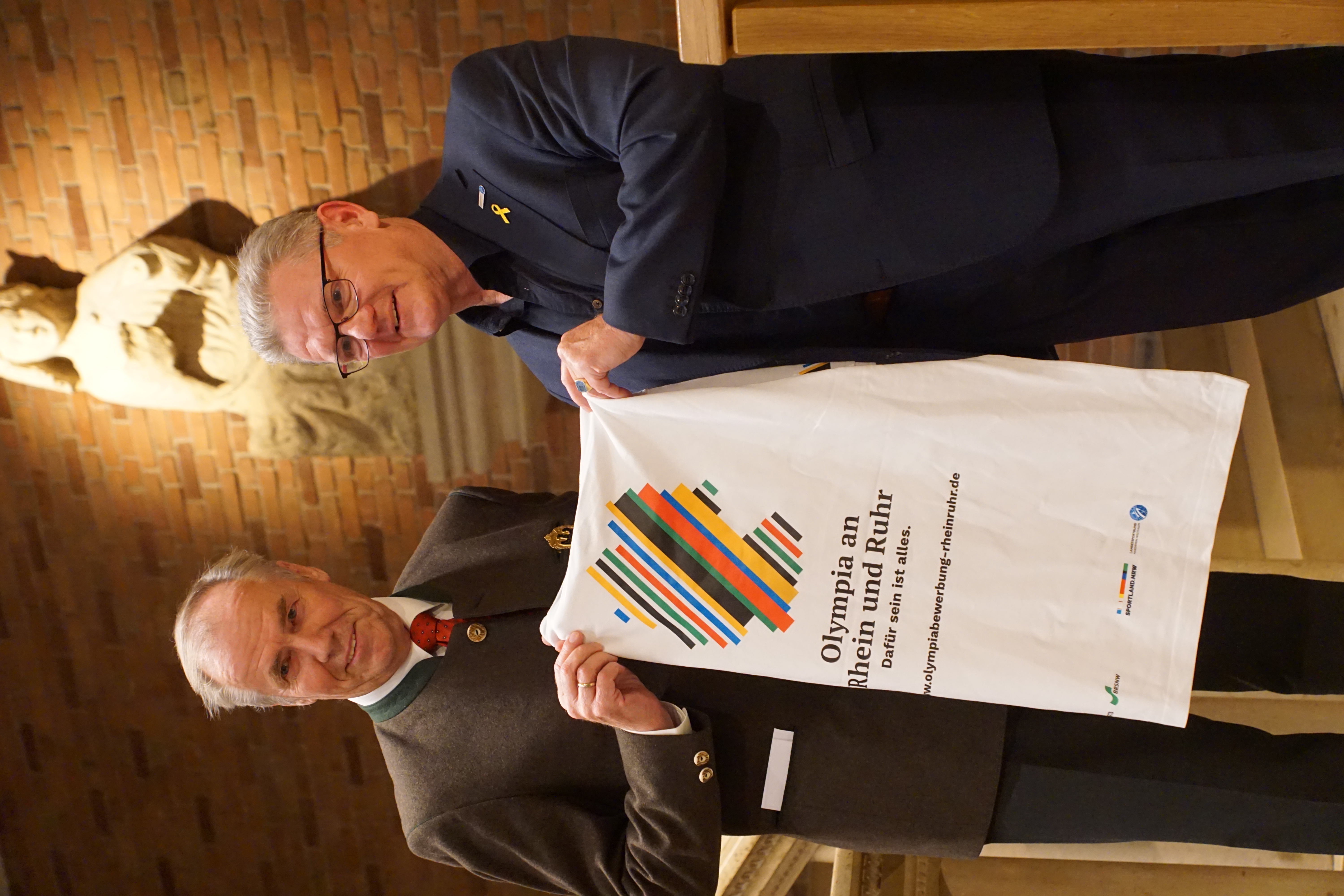 Dieser ließ es sich nicht nehmen ein gutes Wort über Olympia an Rhein und Ruhr zu verlieren und hatte natürlich auch ein kleines Präsent für den Präsidenten des Deutschen Schützenbundes, Hans-Heinrich von Schönfels. Ebenfalls zugegen waren der Geschäftsführer des DSB, Jörg Brokamp, der ursprünglich aus Münster kommt. Und auch der Präsident des Westfälischen Schützenbundes, Dr. Maik Hollmann, hat sich das ganze Wochenende frei genommen um der Veranstaltung beizuwohnen.