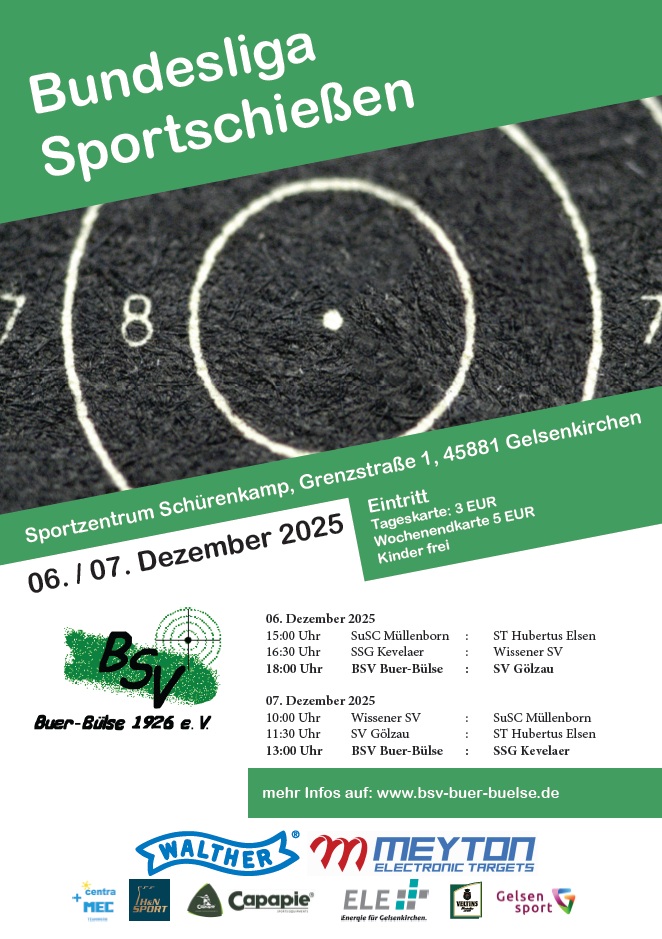 Der BSV BUer-Bülse ist Ausrichter der 1. Bundesliga Nord Luftgewehr am 06./07.12.2025 im Sportzentrum Schürenkamp.