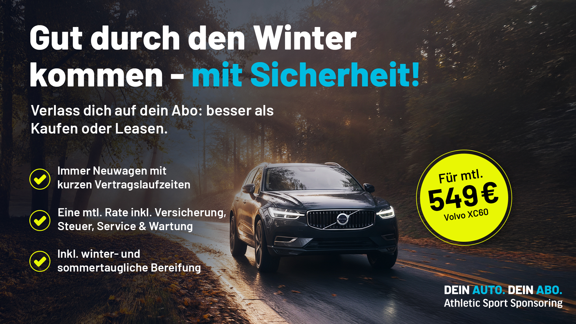 Wie wär’s mit einem nagelneuen Volvo XC60 oder XC90 – bekannt für Sicherheit, Komfort und skandinavische Coolness? Du steigst ein – die ASS kümmert sich um den Rest. Kein Werkstattstress, keine versteckten Kosten.