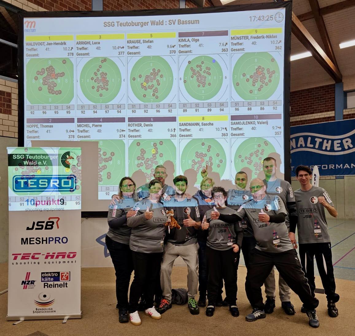 Zu Gast war die SSG Teutoburger Wald bei den SpSch Raesfeld, die Ausrichter der vorletzten Wochenendes, des Dezemberwochenendes, waren. In ihrem ersten Match gegen den SV Bassum ging es heiß her. Luca Arrighi (Teutoburger Wald) gewann seinen Punkt an Position zwei gegen Pierre Michel (Bassum) mit 377:374 Ringen. Auch Stefan Kraus (Teutoburger Wald) lief zu alter Stärke auf und gewann an Position drei mit 370:366 Ringen gegen Denis Rother (Bassum). Den wichtigen dritten Punkt lieferte Frederik Münster (Teutoburger Wald) an Position fünf gegen Valerij Samojlenko (Bassum) mit 362:357 Ringen. Anschließend fielen die Punkte im Stechen nur noch im Einzelpunkteverhältnis ins Gewicht. Jan-Hendrik Waldvogt (Teutoburger Wald) gewann gegen Thomas Hoppe (Bassum) mit 10:9 nach 378 Ringen an Position eins, während Olga Kimla (Teutoburger Wald) an Position vier nach 363 Ringen Sascha Sandmann (Bassum) mit 7:10 unterlag. Ein wichtiges 4:1 für die Westfalen. Gegen den Freischütz Wathlingen am nächsten Tag konnten die Westfalen dann aber leider nichts mehr für ihr Teampunktekonto tun, denn mit einem 2:3 unterlagen sie. Luca Arrighi und Olga Kimla machten ihre Punkte, doch an den Positionen eins und drei unterlagen Jan-Hendrik Waldvogt und Stefan Kraus deutlich. Mit 361:363 Ringen wäre der dritte Punkt für Aleksey Tsaturyan gegen Jessica Schrader noch am ehesten drin gewesen.